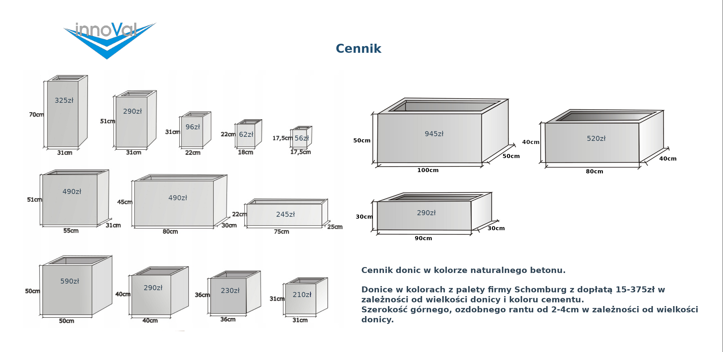 W standardzie produkujemy wszystkie donice na grafice z cenami poniżej oraz wykonujemy także donice o wymiarach na zamówienie.