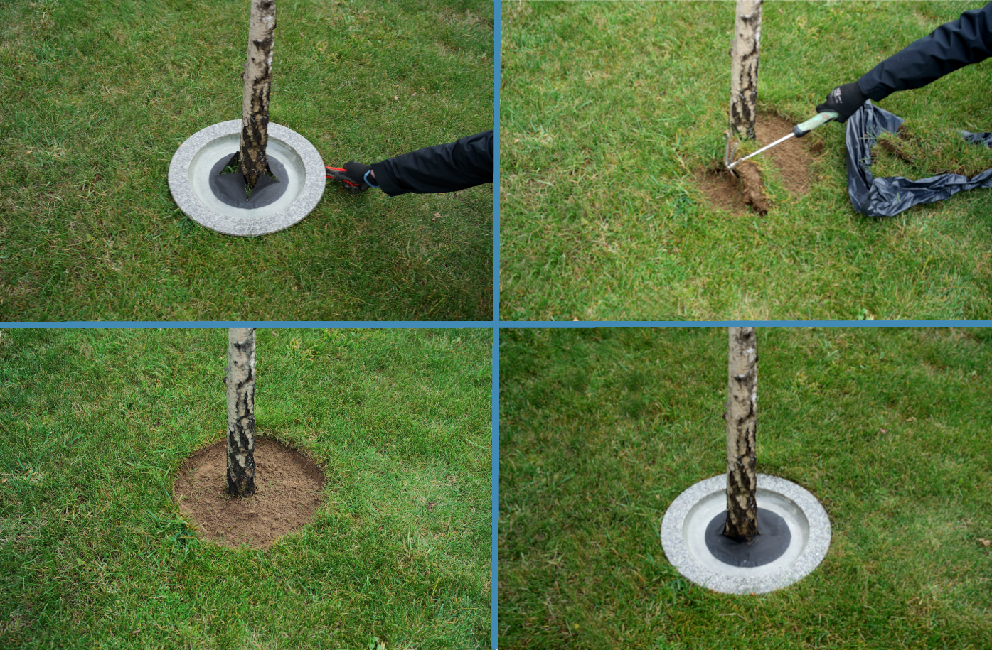 Całe obrzeże trawnikowe posiada otwór o średnicy większej od średnicy drzewa lub rośliny, by uwzględnić jej wzrost. Otwór wyłożony jest naciętą promieniście geowłókniną, która podczas rozrostu rośliny dostosowuje się do średnicy drzewa lub rośliny, jednocześnie eliminuje wzrost chwastów.